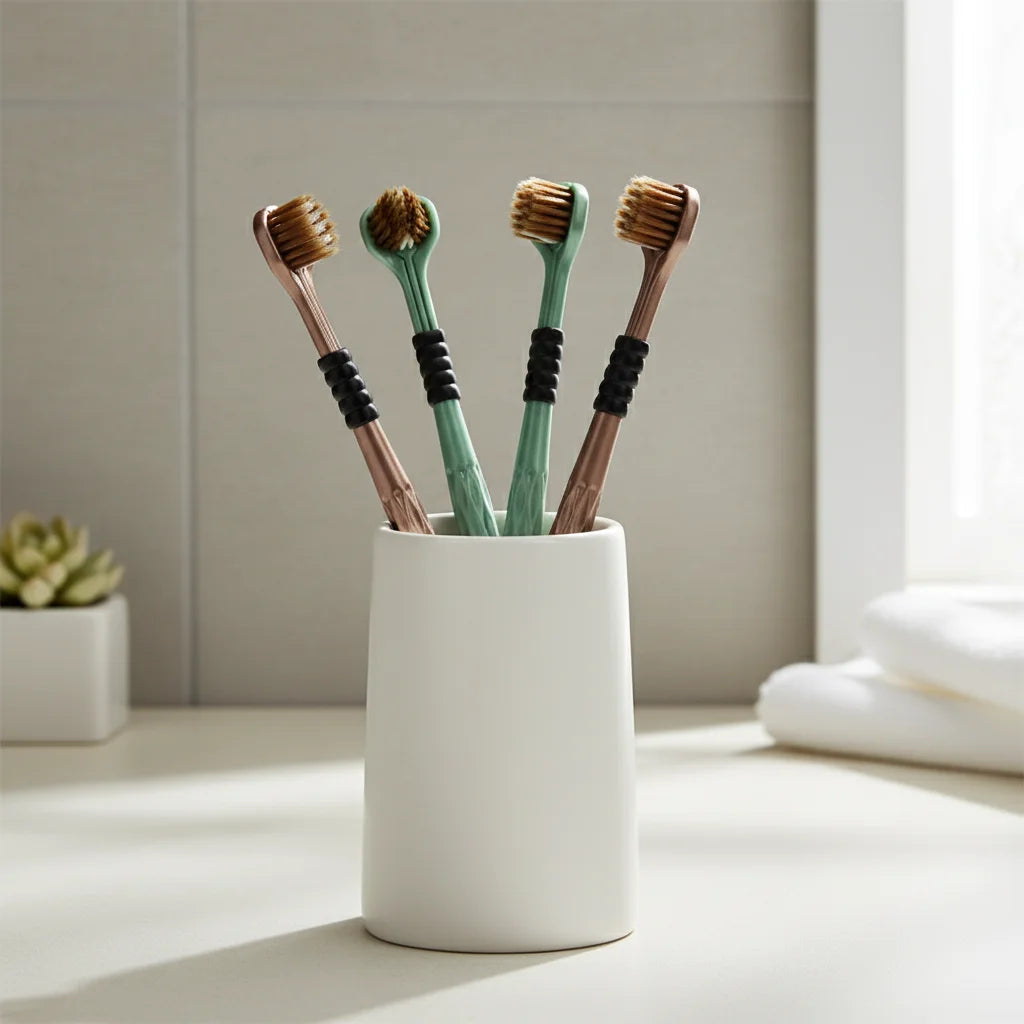 The OraWrap 3D Brush features ultra-soft bristles and a unique U-shaped head that gently wraps around your teeth, providing a comprehensive clean without irritating sensitive gums or enamel. It's designed for comfort and effectiveness.